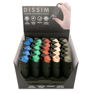 DISSIM SLIM SINGLE TORCH LIGHTERS IN DISPLAY BOX OF 25 MIXED COLORS