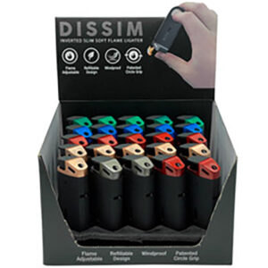 DISSIM SLIM SOFT FLAME LIGHTERS IN DISPLAY BOX OF 25 MIXED COLORS